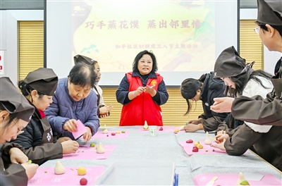3月6日,潞州区东街街道办事处和平社区开展“巧手蒸花馍 蒸出邻里情”主题活动。本报记者 梁栋 摄