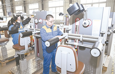 作为全市重点健身器材专业制造商,澳瑞特体育产业股份有限公司加大技术创新,注重产品研发,不断推出满足全民健身的产品。图为3月28日,公司总装车间内,工人在调试器械部件。