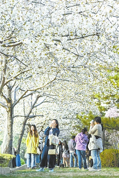 4月3日,市民在八一广场两侧盛开的樱花树下赏花游玩。连日来,人们纷纷走出家门,踏春赏花,欣赏春天美景,感受长治美好春光。