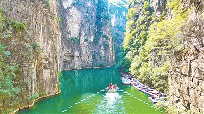 端午假期,人们纷纷走出家门,赏美景、品民俗,尽享多姿多彩的美好时光。图为游客在平顺县通天峡景区乘游船穿梭于太行山峡谷间,感受山水之美。