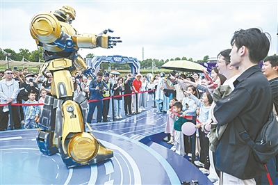 6月2日,在武汉市蔡甸区花博汇景区,游客与机器人互动。