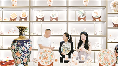 6月12日,北京游客在长治文旅中心选购八义窑红绿彩瓷。上党区八义窑距今有1000多年历史,产品使用本地天然高岭土,采用1350摄氏度高温烧制,大红大绿的色彩搭配是其最大的特色,深受游客喜爱。