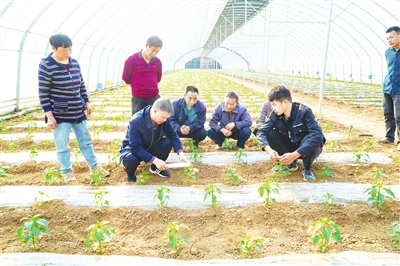 4月10日,宋村镇小庄村设施蔬菜大棚内,长子县农业农村局高级农艺师王旭,正在为种植户讲解春播大青椒的水肥管理技术。专家讲解仔细,群众聆听认真。