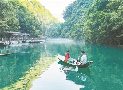 4月28日,游人在鹤峰县屏山旅游景区体验“箬叶”浮碧波(无人机照片)。