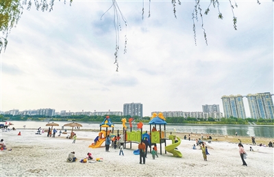 ① 5月5日,襄垣县东湖公园,游客在沙滩游玩。