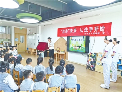 5月16日,长子县人民医院组织医护人员深入漳源幼儿园,依托幼儿园课堂,通过生动有趣的语言、图文并茂的PPT演示等形式,开展手卫生进校园主题教育活动,让幼儿在轻松愉快的氛围中了解正确洗手知识,并现场示范让幼儿掌握七步洗手法,进一步提升幼儿手卫生意识,有效预防传染性疾病传播。