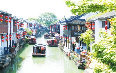 5月19日,游客在江苏苏州山塘街观光游览。