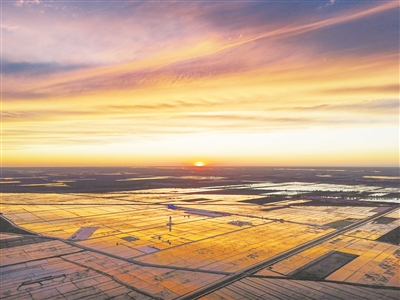 时下,“北大仓”黑龙江省的三江平原正值插秧季。在佳木斯富锦市万亩水稻公园,一块块稻田宛若“天空之镜”,与灿烂的晚霞交相辉映。