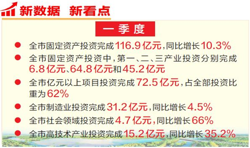 本报讯 记者王涵 通讯员张贤报道:今年以来,我市深入贯彻落实全市项目建设年推进大会精神,扎实开展“三个一批”活动,狠抓项目建设不松劲,全力以赴推动项目签约落地、开工建设、投产达效,为我市不断深化全方位转型、加快推动高质量发展蓄势赋能。一季度,全市固定资产投资完成116.9亿元,同比增长10.3%,比全国增速高5.8个百分点,比全省增速高4.1个百分点。