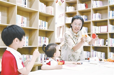 5月23日,在日照市东港区城市书房石臼所馆,志愿者在教孩子拓印。