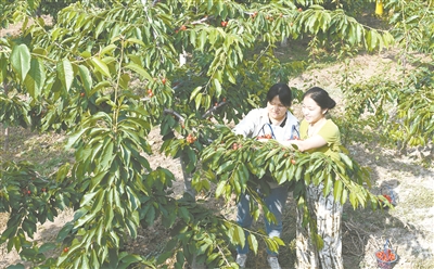 5月27日,在上党区郝家庄乡南郭村水清清农林科技有限公司樱桃采摘园,游客在采摘樱桃。连日来,该村樱桃迎来采收季,吸引游客前来体验采摘快乐,感受田园美景。