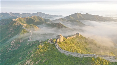 当日清晨,位于河北省承德市滦平县的金山岭长城景区云蒸霞蔚,浩瀚的云海映衬着古长城,壮观如画。