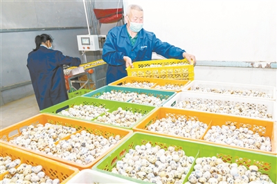 7月10日, 在沁县南里镇中里村晋飞农牧开发有限公司鹌鹑养殖基地,农户们忙着拣拾鹌鹑蛋。该公司以鹌鹑肉、鹌鹑蛋、鹌鹑有机肥的生产供应为主,属于村企共建鹌鹑养殖项目。目前,该基地现存栏15万只鹌鹑,每天可稳定提供2000多斤鹌鹑蛋供应市场。依靠特色养殖,小小鹌鹑蛋成为农民致富“金蛋蛋”。