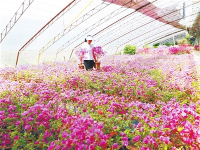 7月10日,花农在武乡县石北乡温室大棚内劳作。近年来,石北乡因地制宜发展蔬菜、花卉温室大棚种植,推动设施农业向标准化、规模化发展,实现农业增效、农民增收。