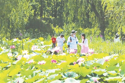 接天莲叶无穷碧,映日荷花别样红。近日,漳泽湖国家城市湿地公园内,荷花盛放,远远望去,荷花荷叶高低错落,摇曳生姿,吸引大批游客前来观赏。