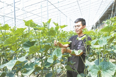 近年来,屯留区上村镇王庄村立足村情实际,以沼气为依托,不断优化农业产业结构,在循环农业产业园区高标准建成水肥一体化蔬菜温室大棚18座,种植种类近10种。图为7月16日,园区工作人员正在察看大棚内的黄瓜长势。