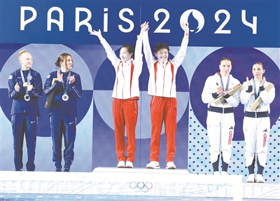 7月27日,冠军中国选手昌雅妮(左三)/陈艺文(左四)、亚军美国选手培根(左一)/库克(左二)、季军英国选手哈珀(右二)/米尤-詹森(右一)出席颁奖仪式。当日,在巴黎奥运会跳水女子双人3米板决赛中,中国选手昌雅妮/陈艺文夺得金牌。