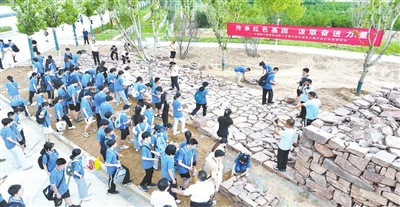 在八路军烈士陵园,跟随讲解员的步伐,来到“众志成城”活动现场,他们从一块石头开始、从一个行动起步,用浸润着先烈们鲜血和汗水的石块垒石筑墙。他们互相协作,神情庄严,好似穿越时空回到了那个硝烟弥漫、浴血奋战的烽火年代。