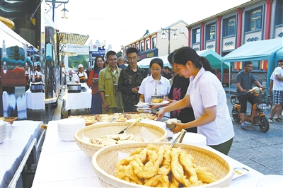 跨如意桥,入宝塔街,学生们来到武乡最古老的街区。映入眼帘的是错落有致的摊位,武乡枣糕、武乡烩菜、干面饼子、武乡灌肠……各式各样的特色小吃摊位前,食客们络绎不绝,在灯光的映射下,小城的“烟火气”被点燃,让广大师生赞不绝口。