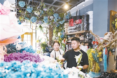 七夕来临,不少市民以花为媒向心爱的人表达爱意。连日来,市区多家花店忙碌起来,鲜花热销点燃城市“浪漫经济”。 王嘉琦 摄