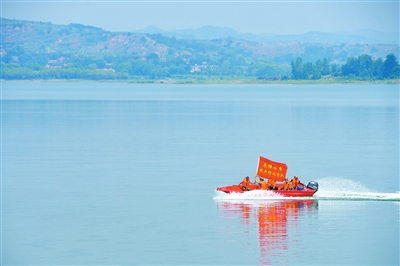 8月15日,屯绛水库的工作人员在防汛巡逻。进入汛期以来,屯留区屯绛水库灌溉服务中心严格执行24小时值班制度,对电力设施、泄洪闸等进行检修,落实防汛行政责任人、技术责任人、巡坝值守人职责,全力确保水库安全度汛。 本报记者 张国平 摄