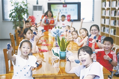 8月14日,在黄石宏维星都书房,小朋友们展示手工作品。