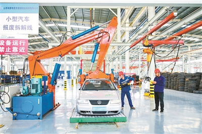 9月9日,山西瑞赛格废弃资源综合利用有限公司的生产车间内,工人在拆解报废汽车。该公司位于屯留区康庄工业园区,具备年拆解3.5万辆报废汽车的能力。近年来,该公司持续提高废旧钢铁资源的利用率,大力推进节能减排降碳,逐步构建拆解、加工、交易、物流一体的废钢产业链条。