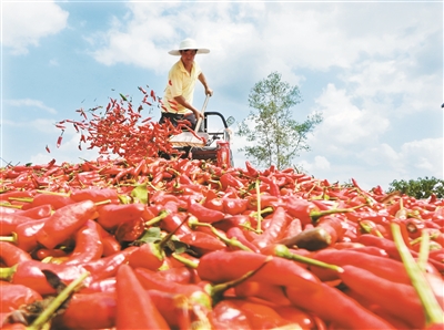 9月13日,在四川省达州市达川区堡子镇长垭村,村民在晾晒收获的红辣椒。金秋是收获的季节,神州大地呈现一派喜人的“丰”景。