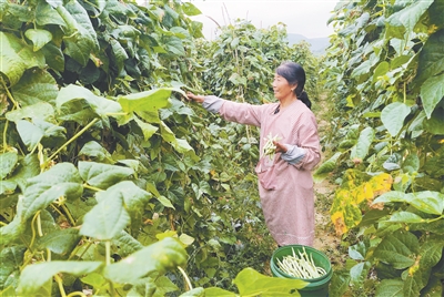 9月15日,务工农民在位于平顺县青羊镇吾乐村的渊森态种植专业合作社种植基地内采摘豆角。近年来,吾乐村依托独特的地理条件和自然优势,因地制宜发展旱地蔬菜种植,推动农业种植模式由分散化、大众化向规模化、特色化转变,有效带动群众增收。