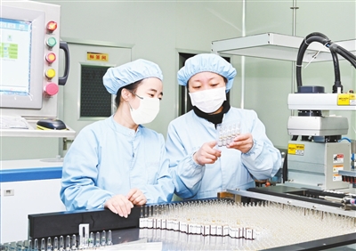 近年来,山西振东集团加大药物创新研发力度,推动企业快速发展。图为技术人员在察看产品生产情况。 本报记者 张国平 摄