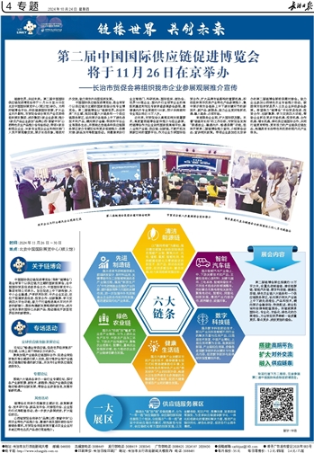 链接世界,共创未来。第二届中国国际供应链促进博览会将于11月26日至30日在北京中国国际展览中心(顺义馆)举办。为用好链博会平台,积极链接国际资源,扩大企业对外影响,市贸促会结合我市产业优势将组织振东集团、成功集团2家企业参展,推介3家农产品企业参加“品牌山西·享誉中华”山西特色农业产品推介会专场活动,带领4家目标观众企业、24家专业观众企业和相关部门人员开展观摩交流,展示长治形象,增进对外交流,助力我市外向型经济发展。