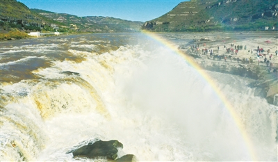 深秋时节,受水库调节放水影响,位于山西吉县和陕西宜川县交界的黄河壶口瀑布水量增大,飞溅的水雾在阳光的照射下,形成“彩虹桥”景观。