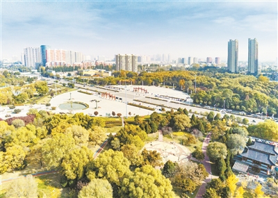 11 月 7 日,航拍下的主城区城南生态苑天朗气清,景色秀美,呈现出一幅城景和谐相融的美丽画卷。作为我市首个融入“海绵城市理念”改造的公园,改造后的城南生态苑以功能更完善、设施更齐全、环境更优美的面貌吸引广大市民前来休闲健身。