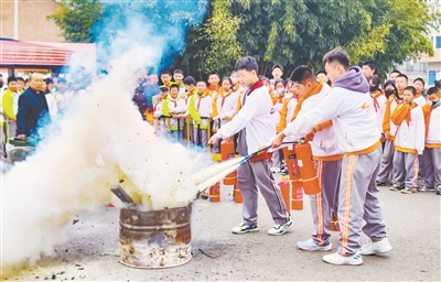 11月9日是“全国消防日”,我市各中小学校纷纷组织开展形式多样、丰富多彩的“消防进校园”活动,进一步提升广大师生消防安全意识和遇险自救能力。图为潞州区实验中学开展“消防演练筑平安校园”活动。