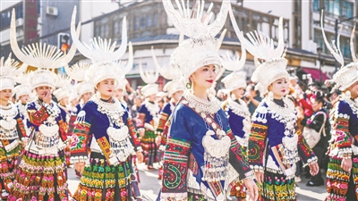 11月10日,身着盛装的苗族同胞参加巡游活动。