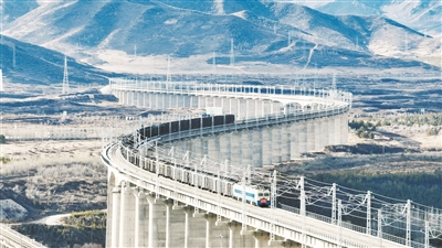 11月21日,在内蒙古赤峰市克什克腾旗,一列由电力机车牵引的货物列车行驶在集通铁路多伦河特大桥上(无人机照片)。
