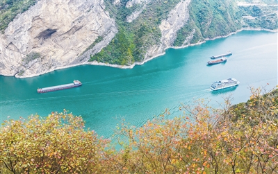 11月20日,船舶行驶在长江三峡西陵峡湖北省宜昌市秭归县水域(无人机照片)。初冬时节,长江三峡西陵峡两岸色彩斑斓,好似一幅美丽画卷。