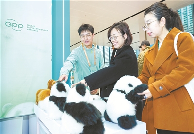 11月26日,嘉宾在2024全球熊猫伙伴大会欣赏大熊猫玩偶。