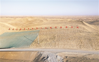 11月28日,在新疆于田县,环绕塔克拉玛干沙漠边缘全长3046公里的绿色阻沙防护带实现全面锁边“合龙”。数十万人40余载不屈不挠搏斗沙海,终在大漠边缘筑起一道绿色长城。