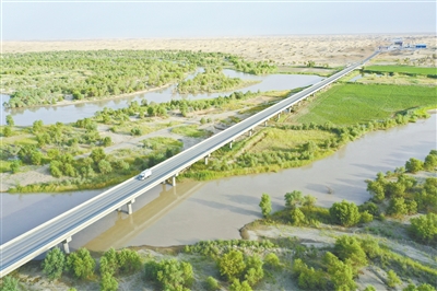 民丰县境内的尼雅河特大桥上,列车呼啸而过,成为沙海里一道亮眼的风景。