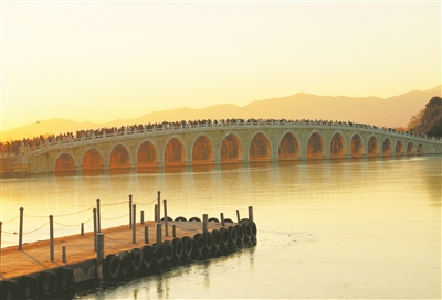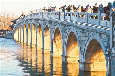 每逢冬至前后,北京颐和园十七孔桥便会上演“金光穿洞”的自然奇观。