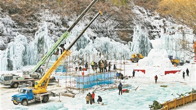 连日来,太行山大峡谷八泉峡景区充分挖掘冰雪资源,丰富游客冬季出游体验,加紧建设冰雪嘉年华项目,把“冷资源”变成“热资源”,让更多人感受冰雪魅力。图为12月28日,工人在紧张施工。