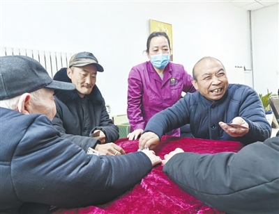 当记者推开娱乐室的门,便看到4人一组的老人们早已开始了每天的快乐时光,扑克甩得“啪啪”作响,笑声、讨论声此起彼伏,还有护工们的友情相助,让整个娱乐室里充满了欢乐。