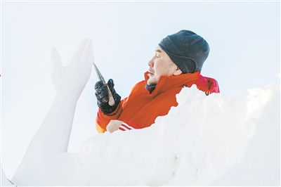 1月6日,参赛选手在哈尔滨太阳岛雪博会园区进行雪雕创作。