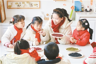 1月6日,在江苏省南京市安德门幼儿园,老师教小朋友辨识制作腊八粥所需的食材。