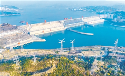 1月10日,在湖北宜昌拍摄的三峡大坝和三峡电站外送输电线路(无人机照片)。