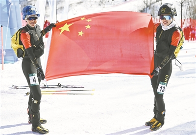 2月9日,中国选手次旦玉珍(左)与队友于婧萱庆祝。次旦玉珍获得冠军,于婧萱获得亚军。当日,第九届亚冬会滑雪登山女子短距离决赛在亚布力举行。 新华社记者 谢剑飞 摄