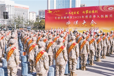 从太行出发,向军旗报到。3月17日,潞州区2025年度春季入伍新兵欢送大会在八一广场举行,一批身着崭新军装、胸戴大红花的新兵整齐列队,精神抖擞,满怀豪情地迎接即将开启的军旅生涯。