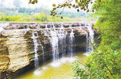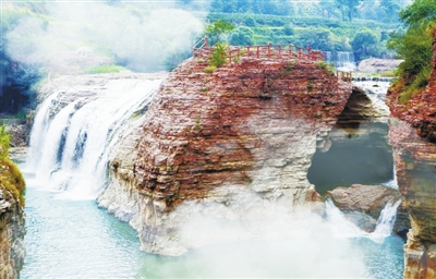 风月共赏,山水相依。“赤壁悬流”的俊水与“彩凤来仪”的青山相互辉映,自成一派。陡峭的崖壁如被巨斧劈开,气势磅礴。一道飞瀑从百米高空奔腾而下,似银河决堤,咆哮着、怒吼着,撞击在嶙峋的岩石上,溅起层层白色的水花,如烟如雾,如梦如幻。阳光洒下,瀑布被染成金色,与赤壁相映成趣,宛如一幅天然的油画。