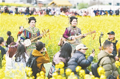 3月16日,在贵州省榕江县车江大坝,村民们穿着民族盛装参加花田走秀。当日,在贵州省黔东南苗族侗族自治州榕江县车江大坝,一场以“村秀·秀未来”为主题的民族服装秀在花田间举行。服装秀以村民为主角,以花田为舞台,展示黔东南多姿多彩的民族文化。